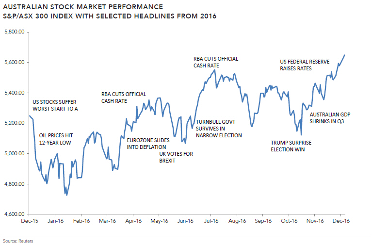 The chart below highlights some of the year’s major news events in context of broad Australian market performance. These headlines are not offered to explain market returns but to show that investors should view daily events from a longer-term perspective and avoid making investment decisions based solely on the news.