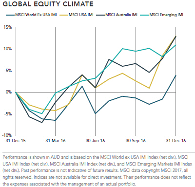 Value stocks were strong performers on the Australian market, while there was a more modest premium from small cap stocks over the year. Australian and international fixed interest finished stronger over the year, although both were punished in the final quarter as US Treasuries sold off after the Trump victory.